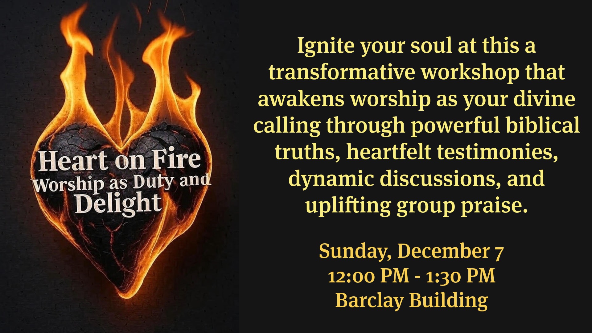 Ignite your soul at “Heart on Fire: Igniting Worship as Duty and Delight,” a transformative workshop that awakens worship as your divine calling through powerful biblical truths, heartfelt testimonies, dynamic discussions, and uplifting group praise.