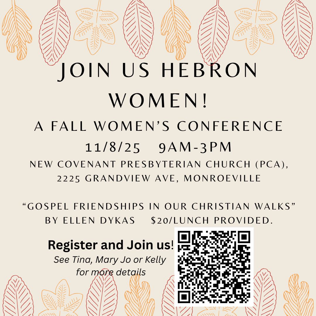 Hebron Church’s Women’s Ministry Team is encouraging ladies to attend the Pittsburgh Presbytery Women’s Ministry Fall 2025 Conference at New Covenant Presbyterian Church. This will be a day of encouragement, fellowship, and refreshment as we have the opportunity to hear from Ellen Dykas, who will speak on the topic of Gospel Friendships in our Christian walks. Our time together will also include worship music, breakout sessions, refreshments, and lunch.