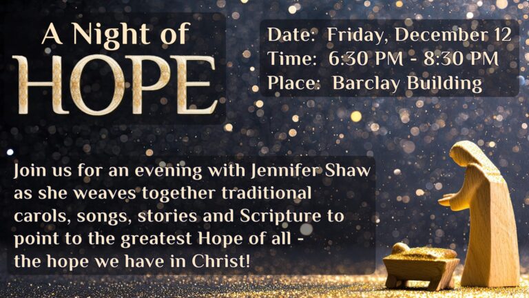 “A Night of Hope” with Jennifer Shaw weaves together traditional carols, Jennifer’s songs and stories, and Scripture to point to the greatest Hope of all – the hope we have in Christ! Bring a friend and join us this Christmas season as we look at Jesus, the greatest gift ever given to the world, and how His coming allows us all to have confident and eternal hope in Him.