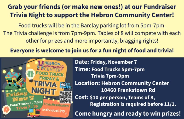 Grab your friends (or make new ones!) at our Fundraiser Trivia Night to support the Hebron Community Center!